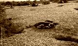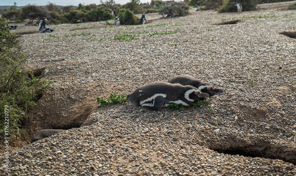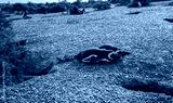 Two baby penguins are laying on the ground