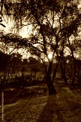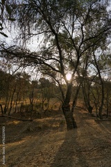 Warm sunlight filters through trees in a serene forest during late afternoon