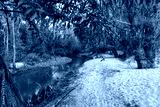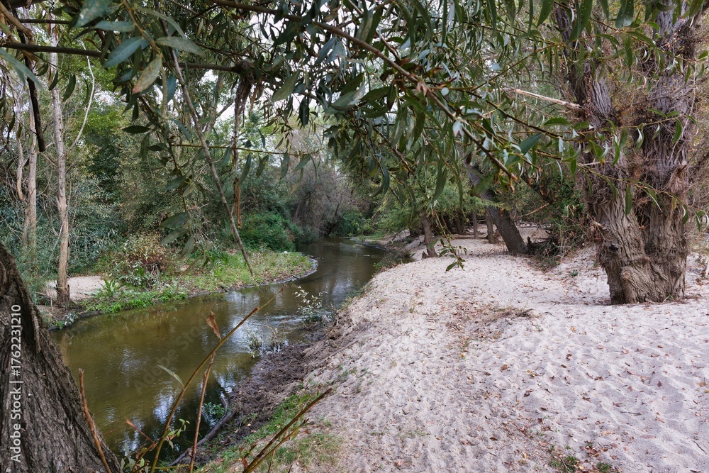 Serene riverbank surrounded by lush greenery near a sandy shoreline in a peaceful natural setting