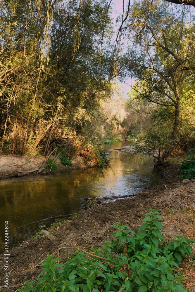 Quiet riverbank in a lush forest at sunset with gentle water flowing and sunlight filtering through the trees