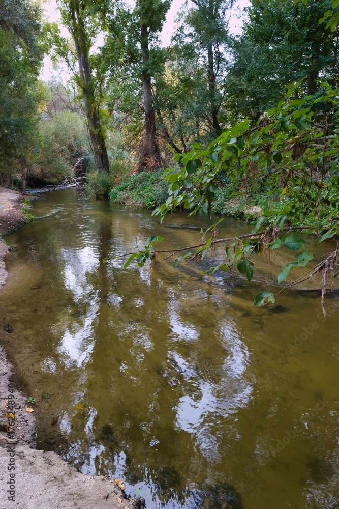 Serene river scene with trees reflecting on the water surface at dawn in a peaceful natural setting