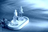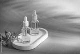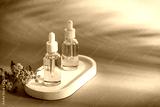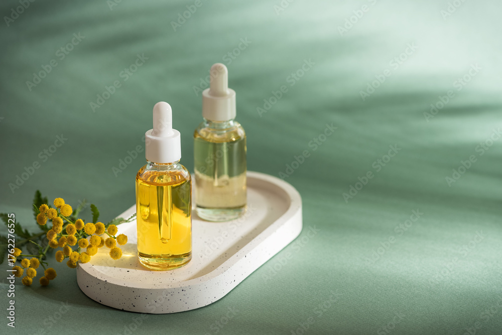 Beauty serum in dropper bottles in sunlight against a green background with yellow wildflowers. Selective focus.