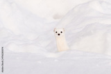Full-face portrait of a white stoat weasel in snow