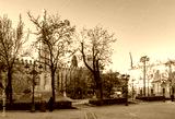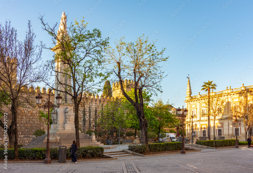 Triumph square with Alcazar walls and Archive of Indies, Seville, Spain