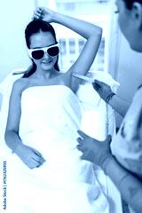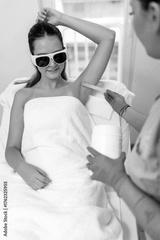 A young woman's skin is being prepared with a cooling gel by a technician in a bright salon.