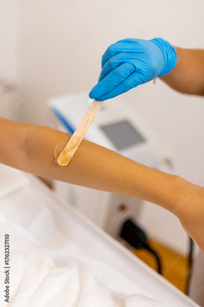 A young woman's skin is being prepared with a cooling gel by a technician in a bright salon.