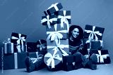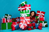 Playful multiethnic girl enjoys festive christmas gift pile and colorful presents in a bright blue studio creating a magical holiday moment
