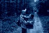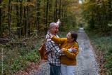 Happy Active mature couple walking through autumn forest trail together showing love and unity, happiness forest trail, golden years, outdoor activity, scenic route