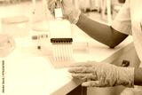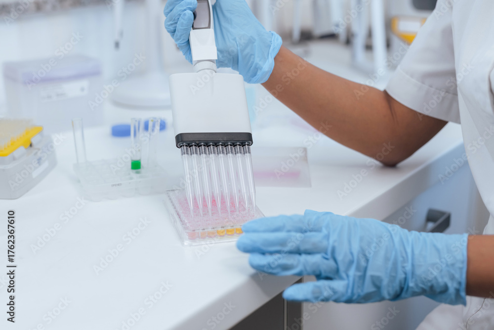 Female laboratory researcher, smiling Asian woman pipetting samples into multiwell plate. Blood testing, health, and medicine concepts.
