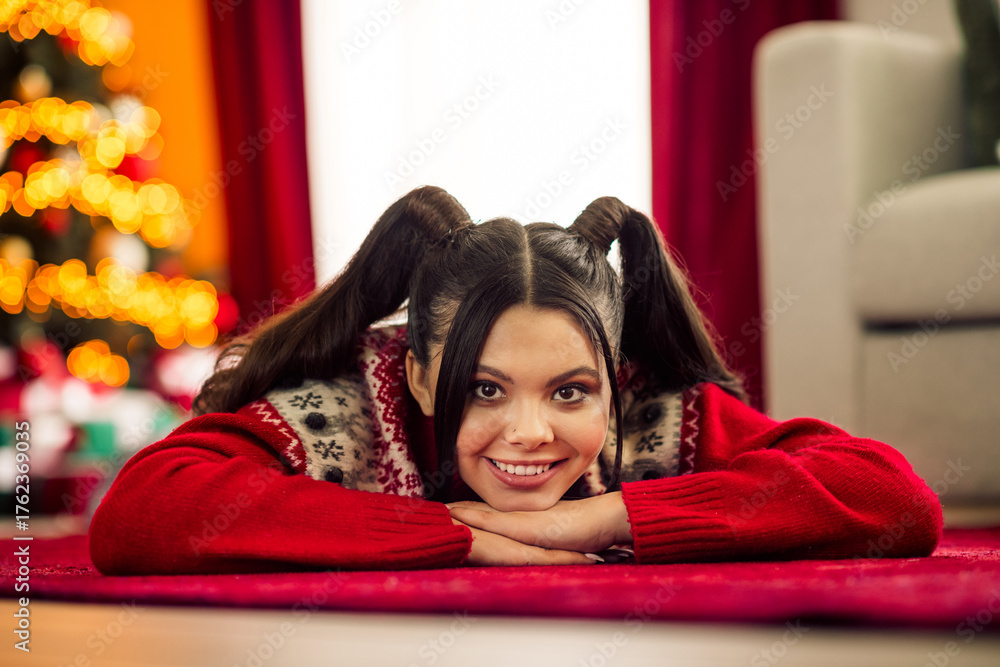 Joyful young woman in a cozy red sweater relaxing indoors with festive holiday decorations and a glowing Christmas tree