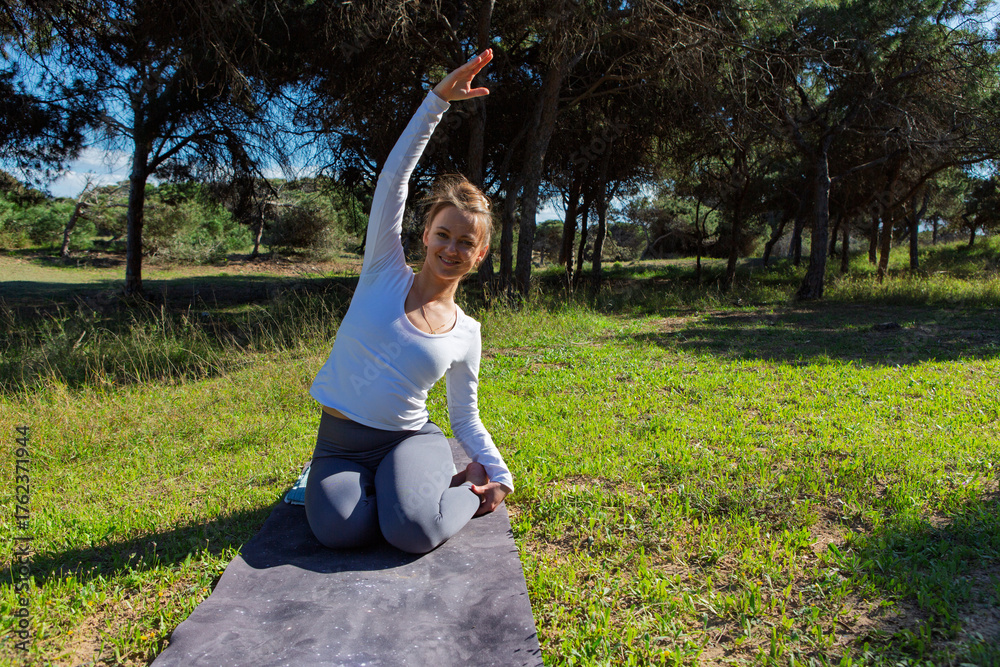 Smiling woman stretching sideways while kneeling on yoga mat outdoors
