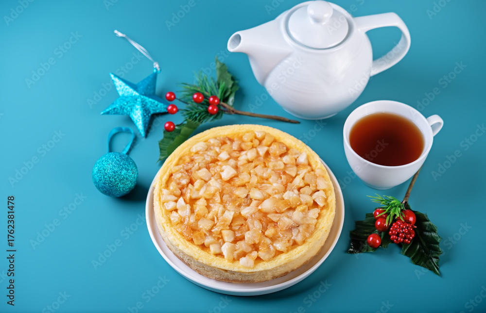 Cheesecake with caramel apple topping on a blue background for Christmas
