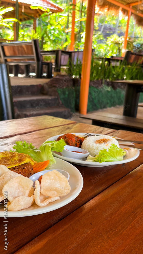 A neatly arranged shot of fried chicken with green chili sambal, fried rice with crackers, and grilled chicken — vivid, warm, and irresistibly mouthwatering.