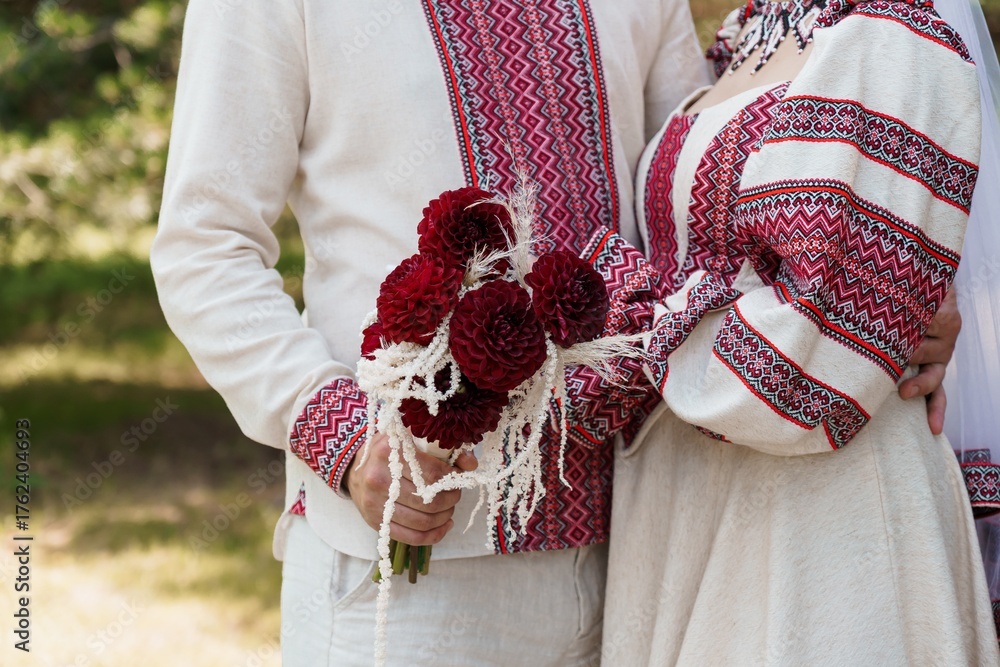 Ukrainian Wedding Ceremony: Traditional Embroidered Outfits, Red Dahlia Bouquet, Couple Embracing, Natural Outdoor Setting, Rustic Style.