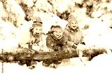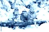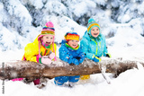 Kids playing in snow. Children play outdoors in winter snowfall.