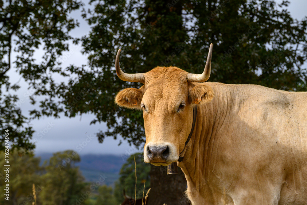 A close up portrait of a light brown cow with horns in a field The Gentle Beauty of a Farm Animal