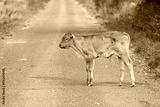 A young brown calf standing alone in the middle of a country road The Innocence of Youth Lost