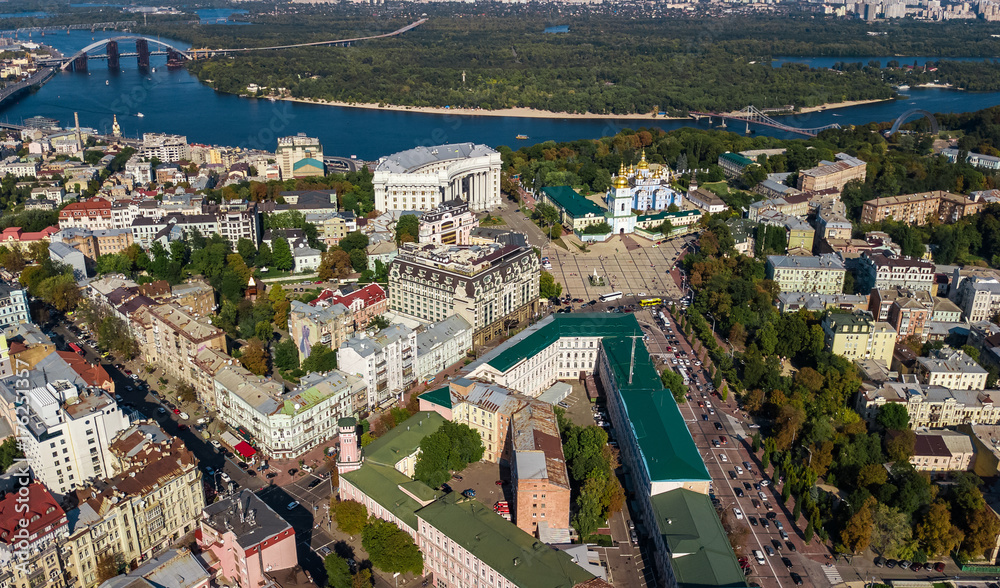 Aerial top view of Kiev city skyline from above, Kyiv center downtown cityscape, capital of Ukraine