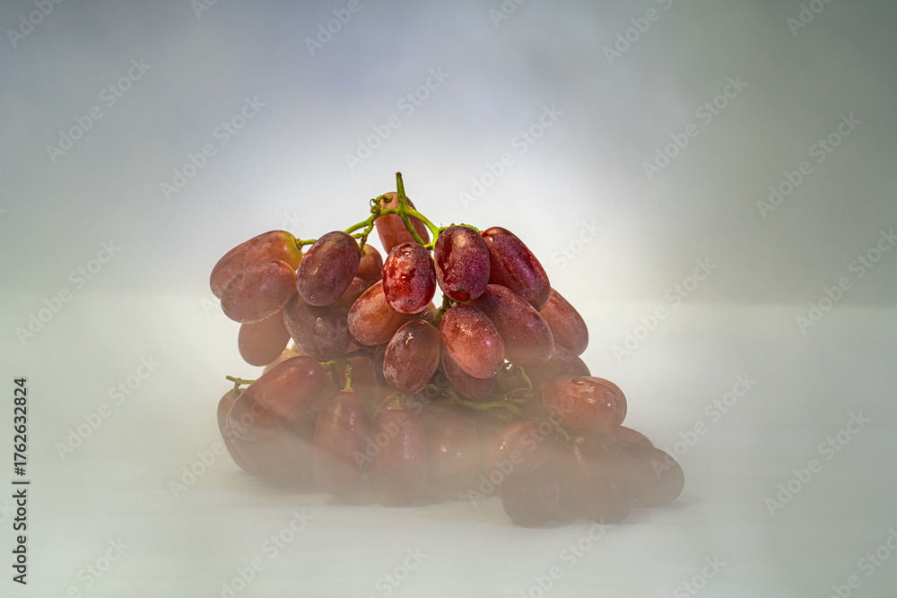 Covered in fine mist, each grape glows with a juicy vibrance that reflects freshness and life. The neutral background emphasizes their rich color and clean, healthy appeal.