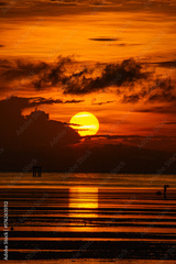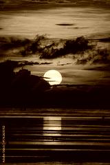 A beautiful view of the sun rising over the horizon, golden light streaming across the sky and reflecting off the water, with a lone lighthouse standing tall in the distance, adding depth to scenery