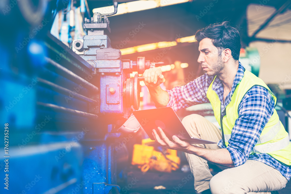 Factory male worker. Engineer man worker working with labtop checking working in industrial manufacturing factory, men at work to checking equipment of machinery production technology or construction.