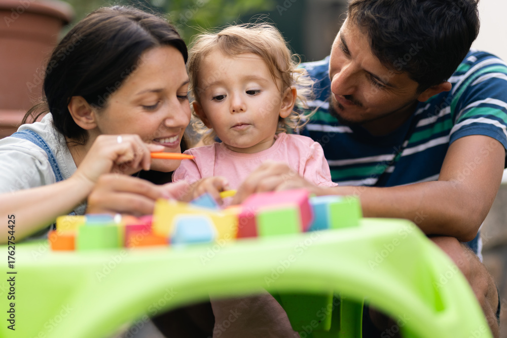 Parents engaging with their child in playful learning activities outdoors