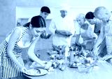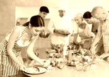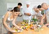 Positive young woman attendee of cooking course decorating meal made of salmon fish together with others