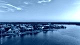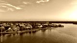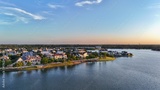 Aerial view of a town with luxurious houses next to Woodlands lake in Houston, United States by sunset time