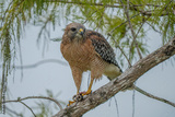 Red-shouldered Hawk perched in a cypress tree with its prey, a snake