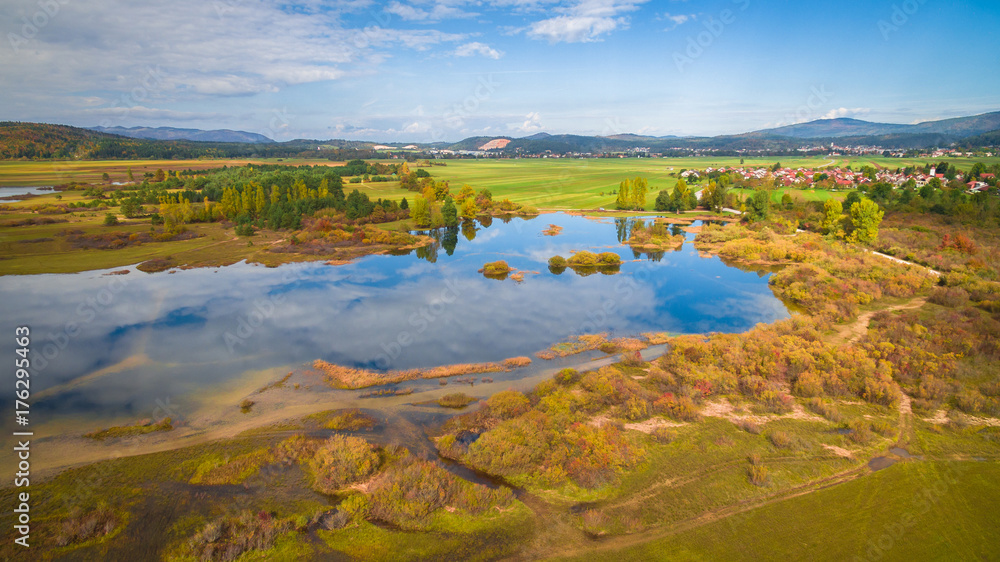 Aerial drone view of amazing autumn colors on the lake. Cerknisko lake, Slovenia