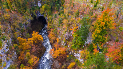 Aerial drone view of amazing autumn colors in fall forest. Rakov Skocjan, Slovenia