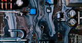Ink flow. Digital hardware. Defocused orange blue colorful glitter water dark black electronic microchip on abstract art background.