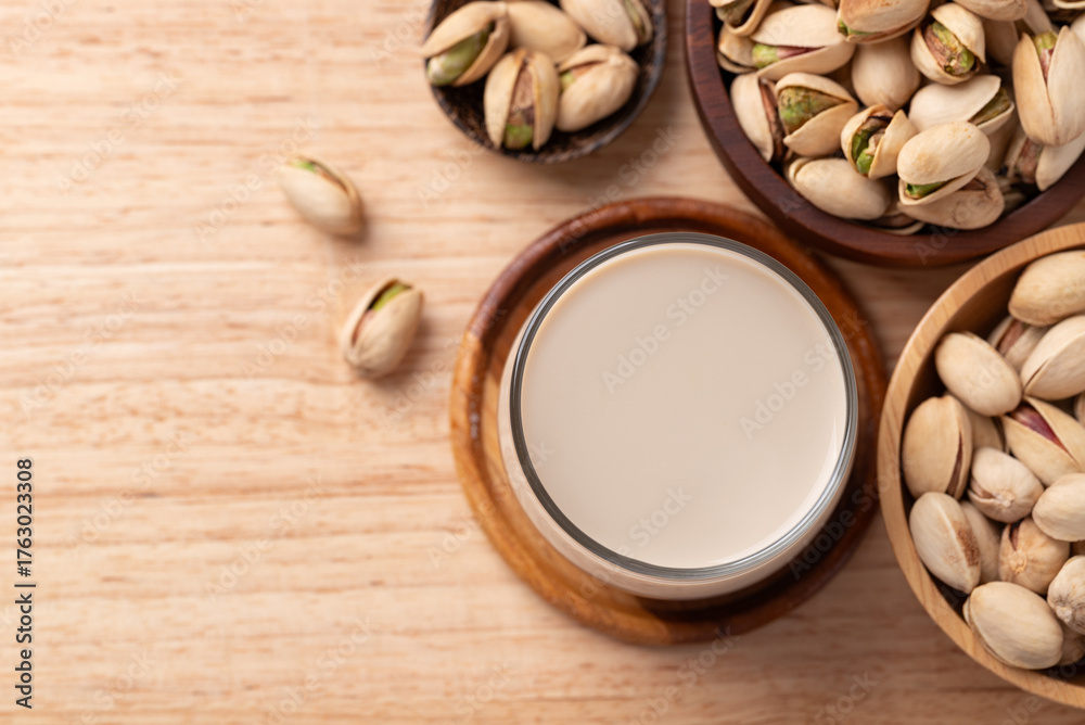 Pistachio milk in glass with pistachio nuts on wooden background, Alternative milk made from plant, Dairy free
