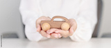 Woman hand holding wood car toy. Car insurance, warranty, rental, Financial, new and repair concept