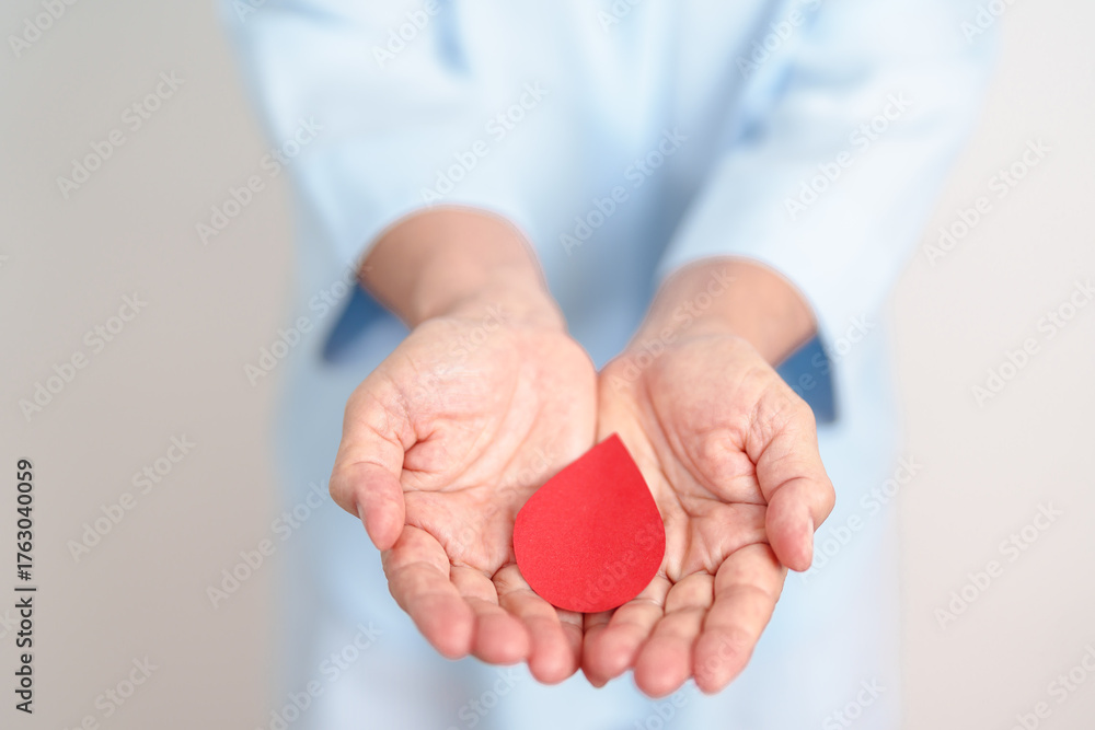 Elderly woman in blue shirt with red Blood drop for World Diabetes Day, Blue November Health month, Diabetes awareness, Blood sugar check, Insulin, Glucose screening, blood donoo and Health checkup