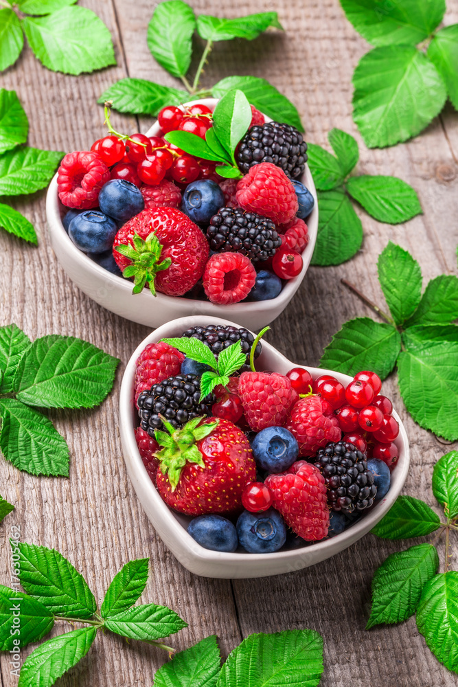 Berries overhead with leaves colorful closeup assorted mix in heart shaped ceramic jars. Raspberry, blueberry, red currant, strawberry on rustic wooden table in studio.