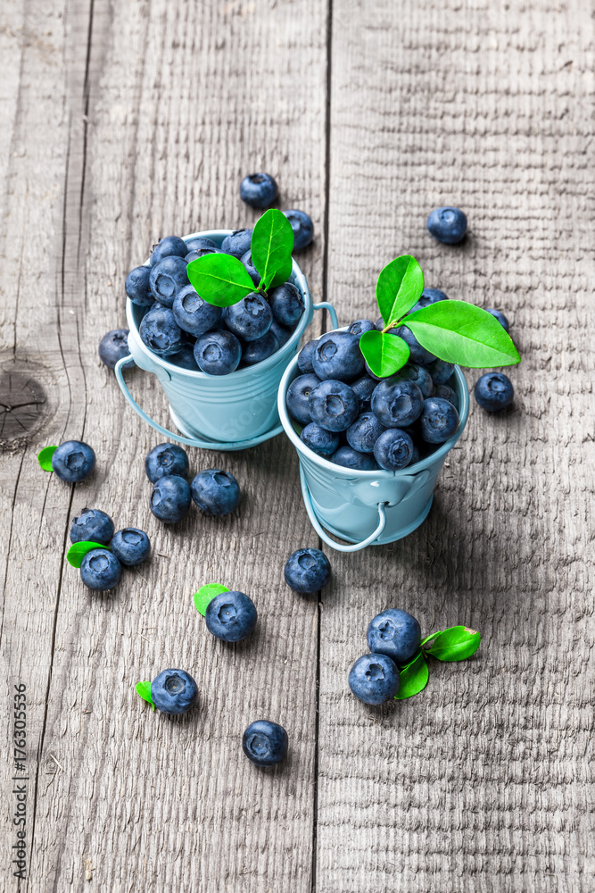 Blueberries with leaves in two blue painted tin cans and spilled fruit overhead on old rustic gray table in studio