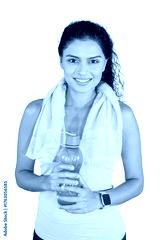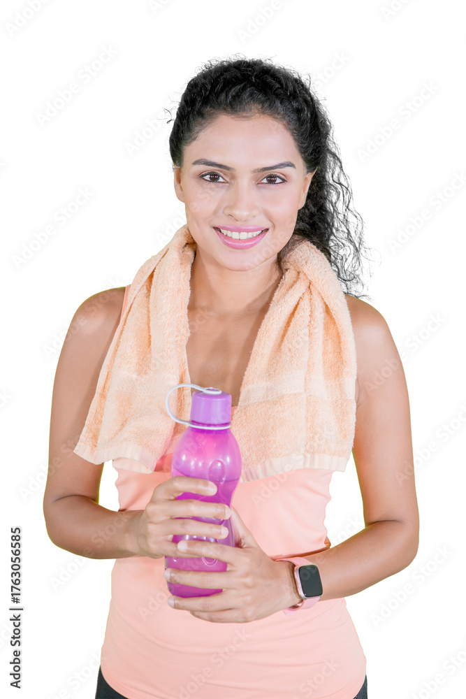 Smiling Indian Woman with Towel and Water Bottle Ready to Hydrate After a Fitness Workout