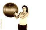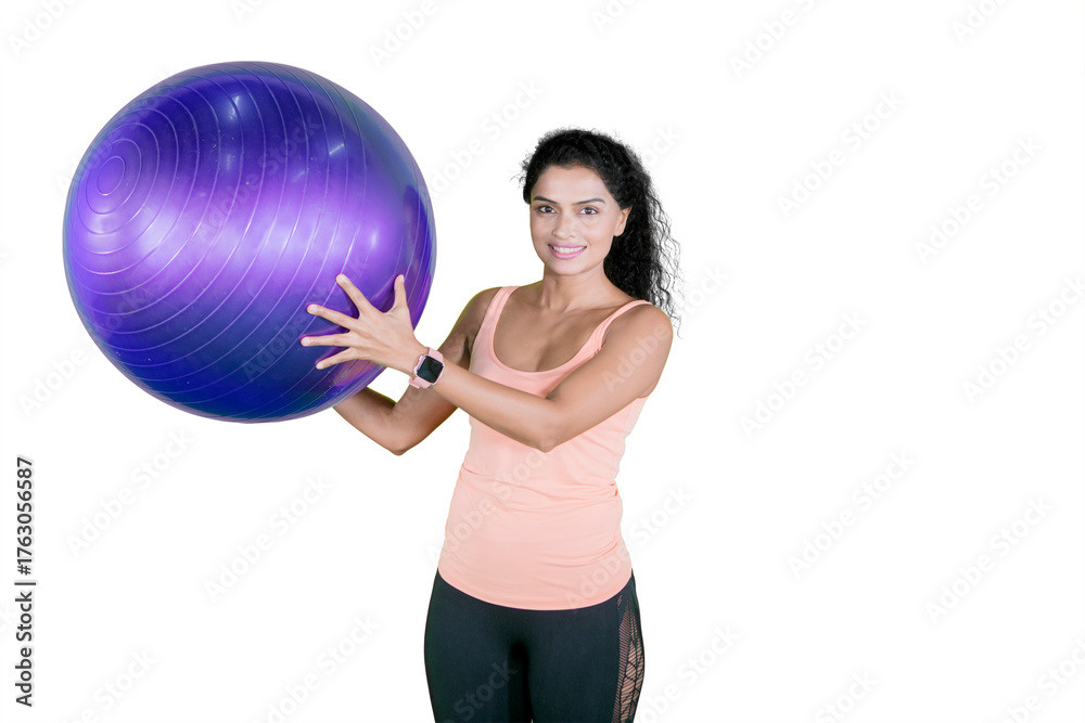 Smiling Indian Woman in Athletic Wear Holding a Large Purple Stability Ball for Core Exercise