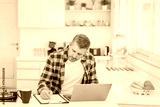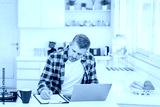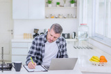 Focused Middle-Aged Man Working Remotely, Writing on a Document and Using a Laptop in a Bright Modern Kitchen
