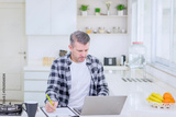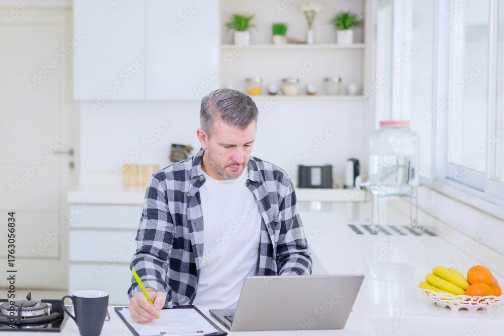 Focused Middle-Aged Man Writing on Document and Working on Laptop in Bright Modern Home Office Kitchen