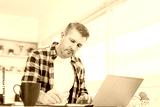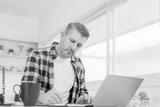 Focused Middle-Aged Man Writing on a Clipboard and Typing on a Laptop in a Bright Kitchen Home Office