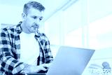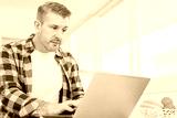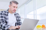 Concentrated Middle-Aged Man Working on Laptop in Modern Bright Kitchen Home Office Setting