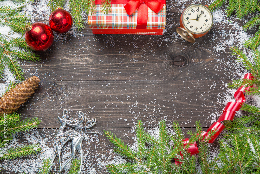 Christmas fir trees in snow with cone, vintage clock, christmas balls, giftbox and deer on a dark wooden board. Copy space for your text.