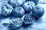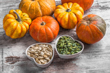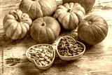 Colorful pumpkins and seeds in two white heart shaped ceramic jars on white rustic table in studio