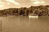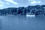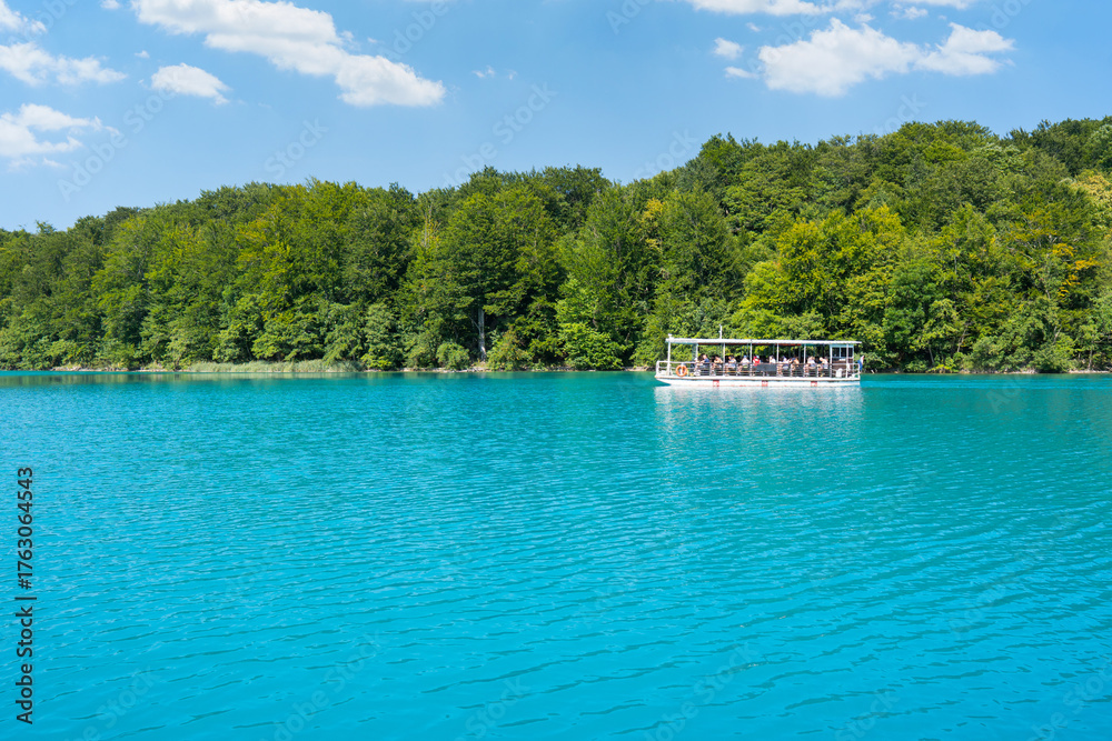People enjoying boat tour on Plitvice Lakes turquoise water