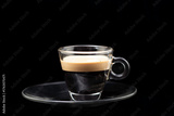 Taza de espresso con crema sobre fondo negro. Taza transparente con café espresso recién preparado, mostrando una capa de crema dorada sobre fondo negro. Fotografía minimalista y elegante.