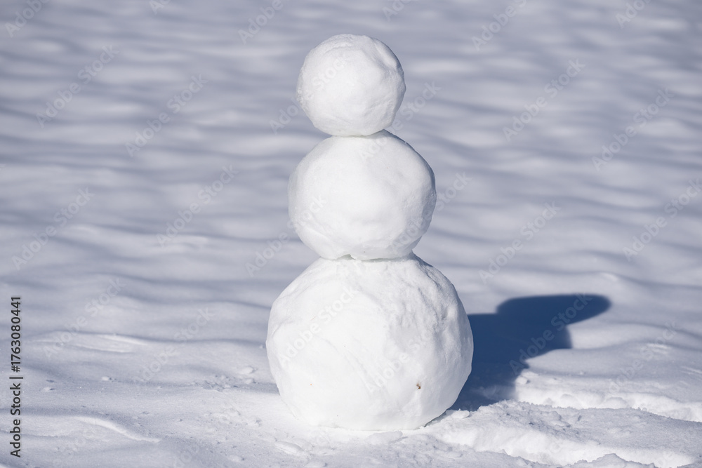 Snow man on outdoor winter field. Winter snowman for New Year design. Snowman with scarf and gloves. Snow man with copy space for banner. Funny snowman.