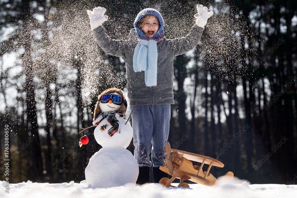 Child playing in snowy winter. Kid having fun with snowball outdoors. Happy child in snowfall. Winter kid playing with snow outside. Child play in snow. Child with winter hat. Snowball game.