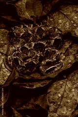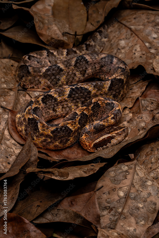 Malayan pit viper (Calloselasma rhodostoma) is endemic to Southeast Asia. This species is well-camouflaged with dry leaves and on the ground.